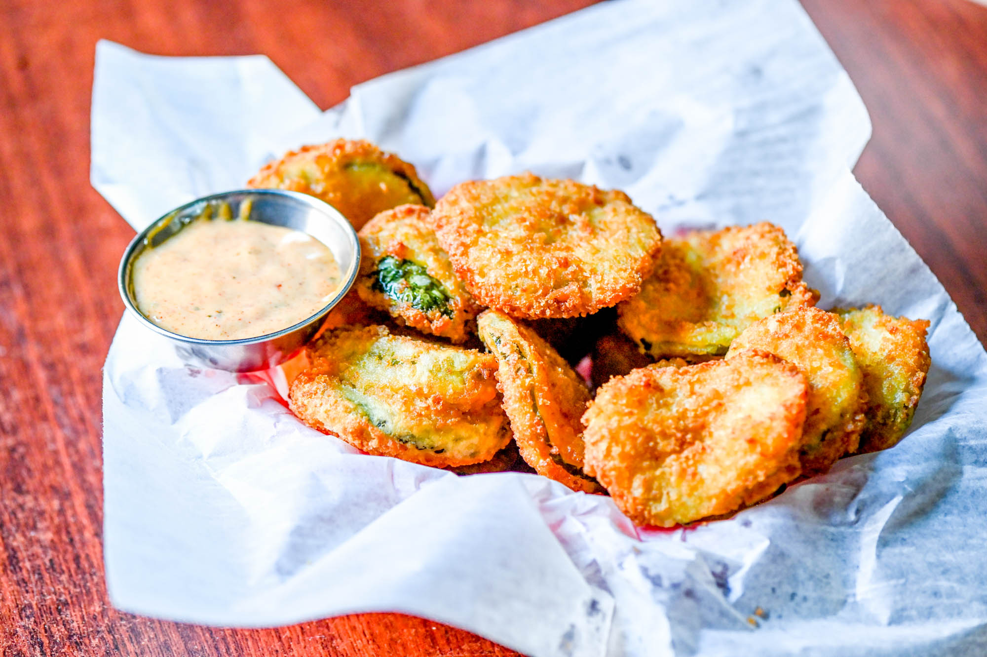 Breaded pickle chips fried to crispy perfection and served with our house sriracha ranch dipping sauce.